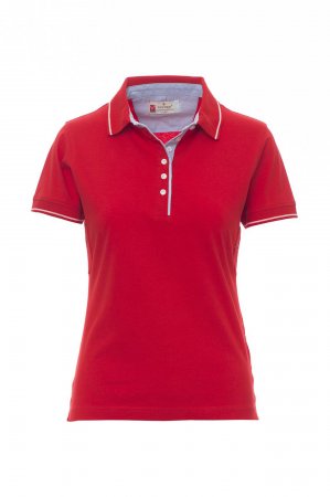 Polo cintré pour femme à manches courtes et 6 boutons blancs, avec intérieur col, patte et fentes latérales en Oxford bleu ciel, col et bordure des manches en bord côtes avec fin profil en contraste, œillets sous les bras, fentes latérales avec couture de renfort, ruban de renfort latéral, coutures stretch, renfort profilé sur encolure arrière